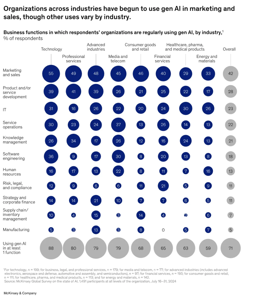 - 71% of companies use Generative AI in at least one business function